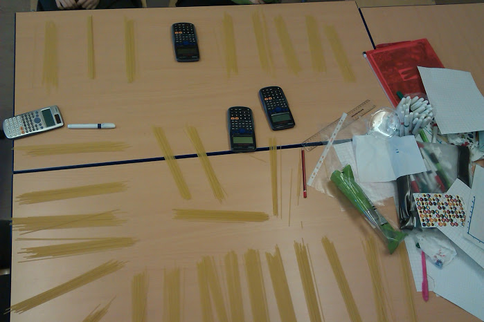 This appealed to me for several reasons. One was the fact he had obviously been participating in life in the kitchen, asking questions and getting answers. Another was the fact that my Year 6 extension group has just finished their work on areas of shapes, and they found measuring the area of circles in square centimetres a big challenge. It would have been so much easier to measure the areas of circles in spaghetti sticks…