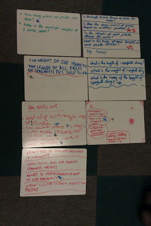 Each of them had a mini whiteboard, silence, and 4 minutes, to come up with 3 or 4 ideas each for a question you could pose, using the spaghetti.